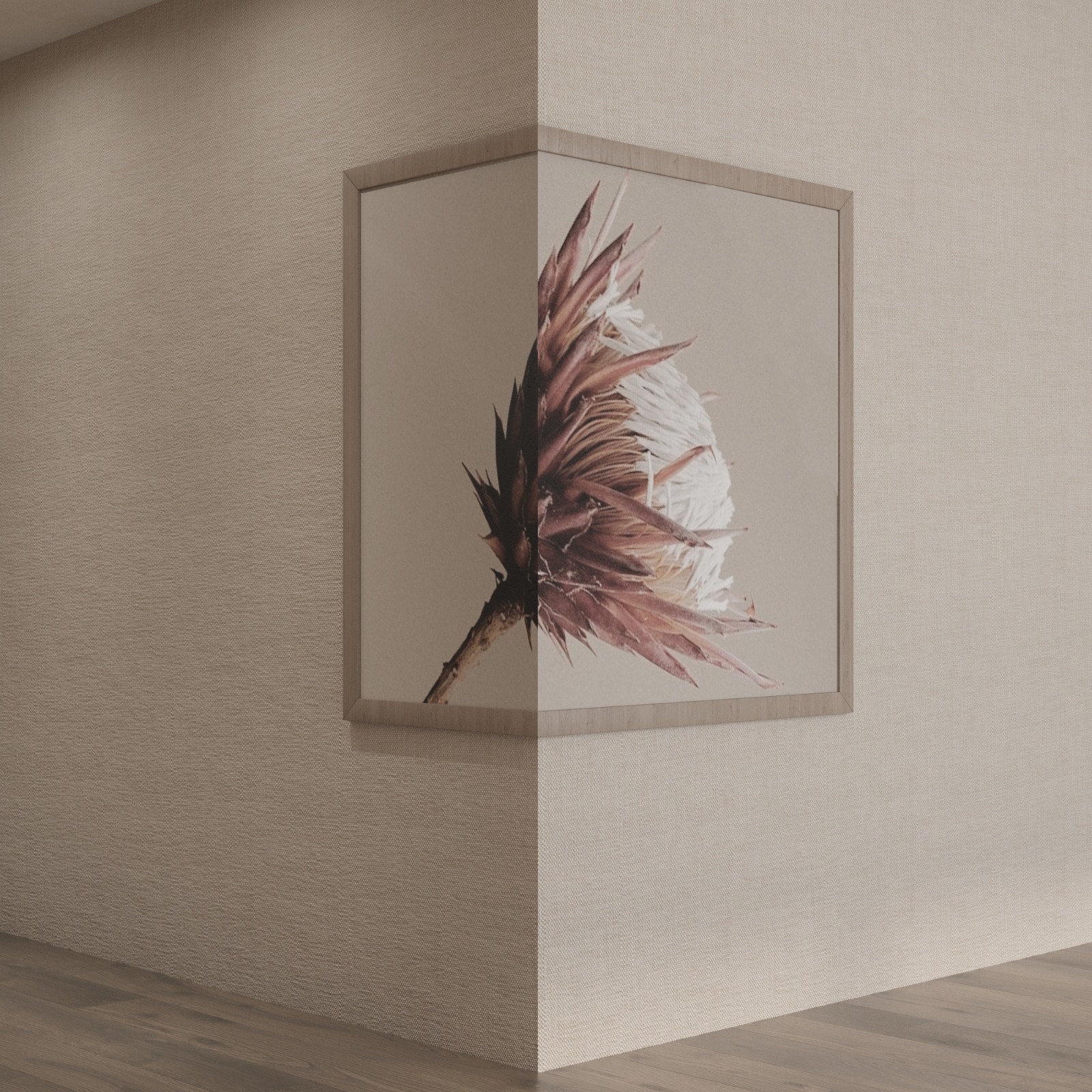 Inspired by the busy Kálvin Square, this frame creates a bold structural statement by wrapping around the outer edge of a wall. It defies the traditional flat-frame format, allowing the organic veneer pattern to flow continuously around pillars or corridor turns.
