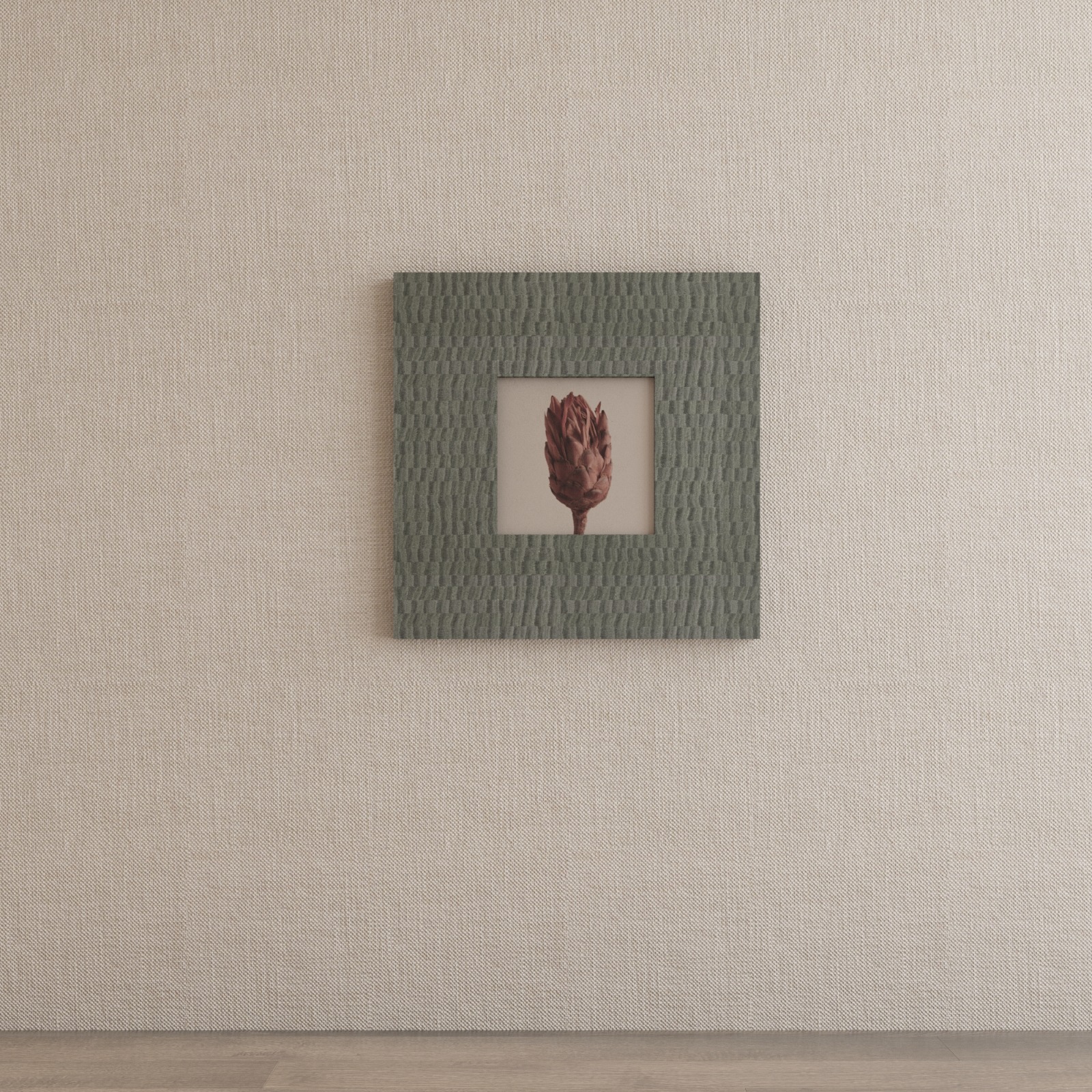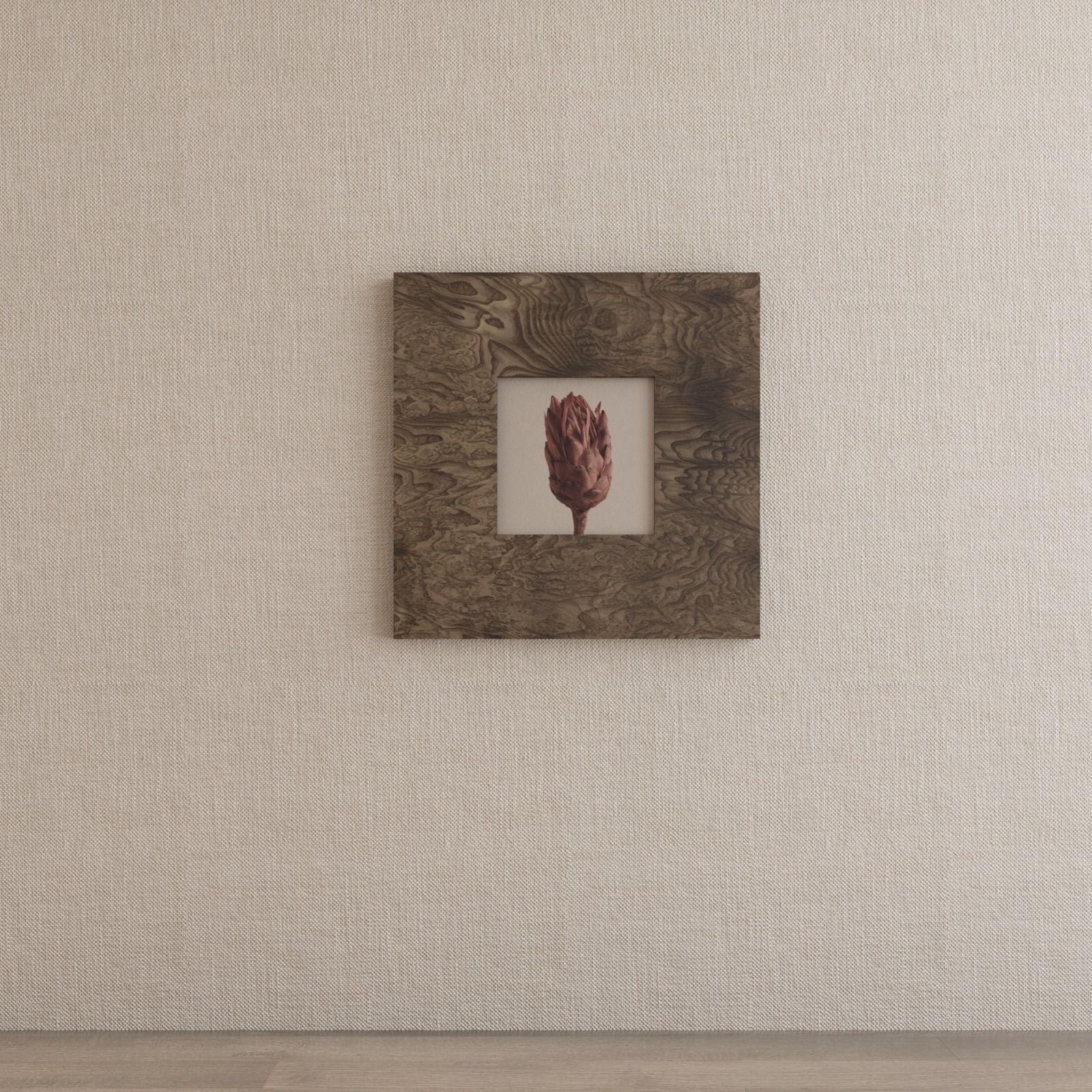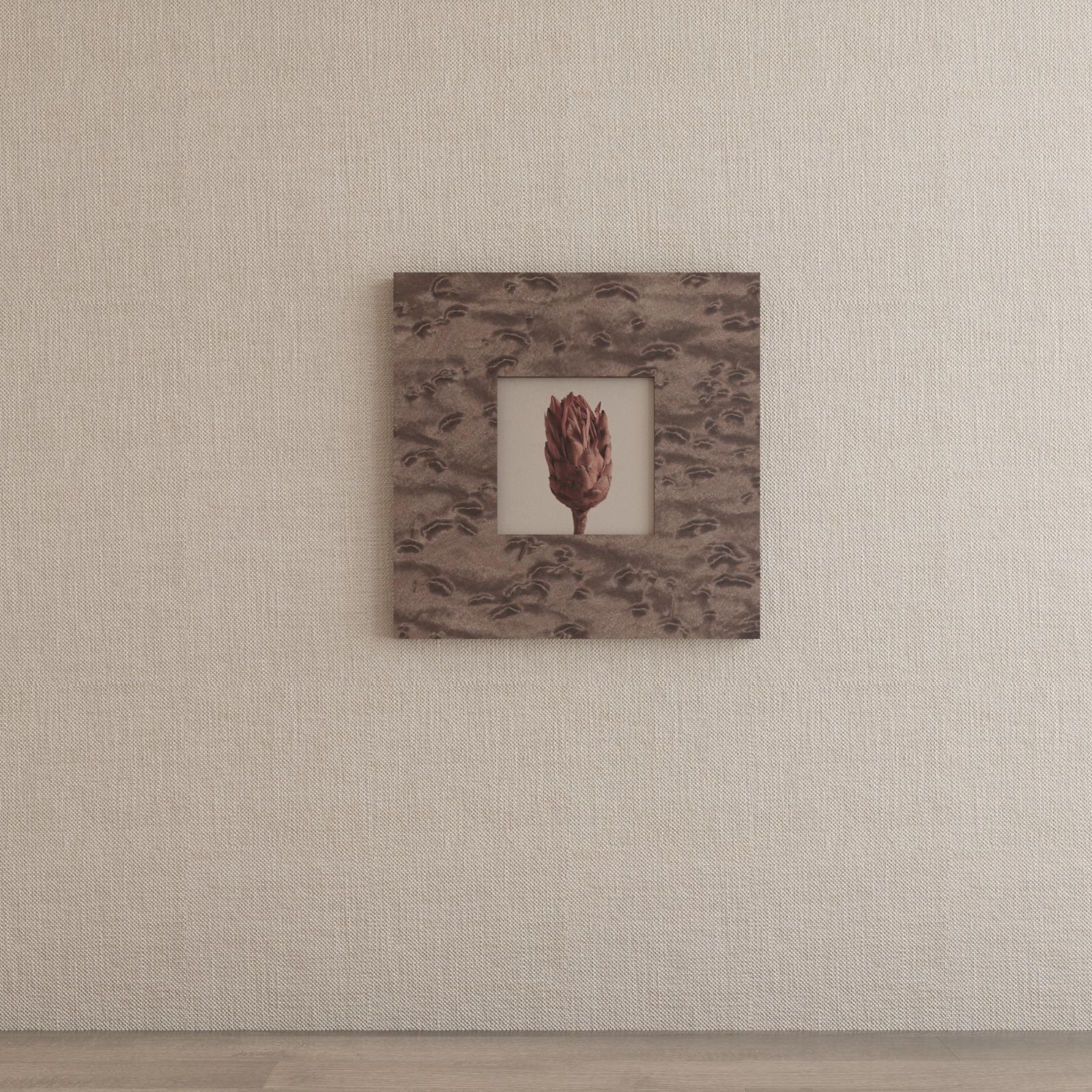 Inspired by the busy Kálvin Square, this frame creates a bold structural statement by wrapping around the outer edge of a wall. It defies the traditional flat-frame format, allowing the organic veneer pattern to flow continuously around pillars or corridor turns.